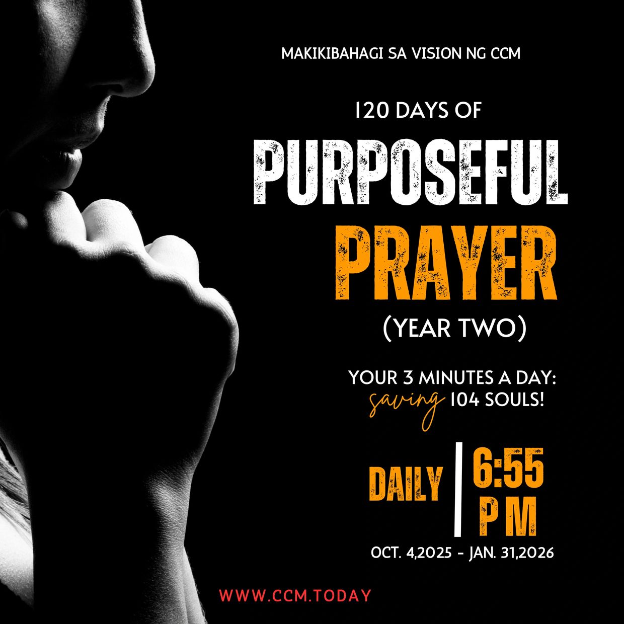 Simula October 4, 2025, hanggang January 31, 2026, inaanyayahan ang lahat na sama-samang manalangin mula 6:55 PM hanggang 6:58 PM araw-araw. Saan ka man naroroon o ano man ang ginagawa mo, huminto sandali at makiisa sa panalangin. Sabayan natin ang live na panalangin sa CCM Facebook page.